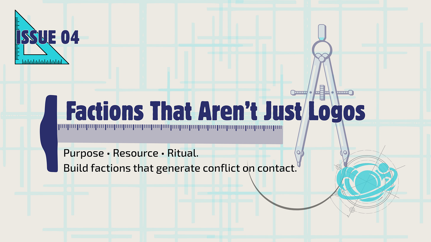 This issue is about installing the Purpose • Resource • Ritual chassis—so your factions last, make history in your lore, and create plot pressure on contact instead of waiting for the story to “give them something to do.”